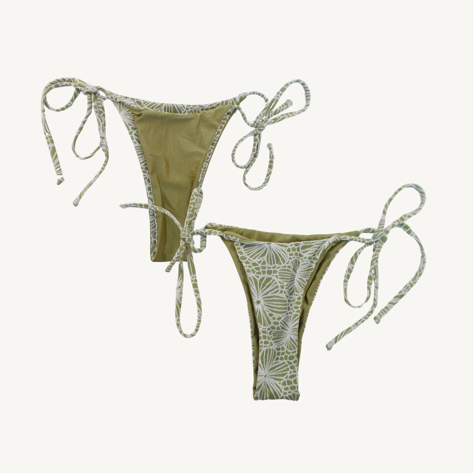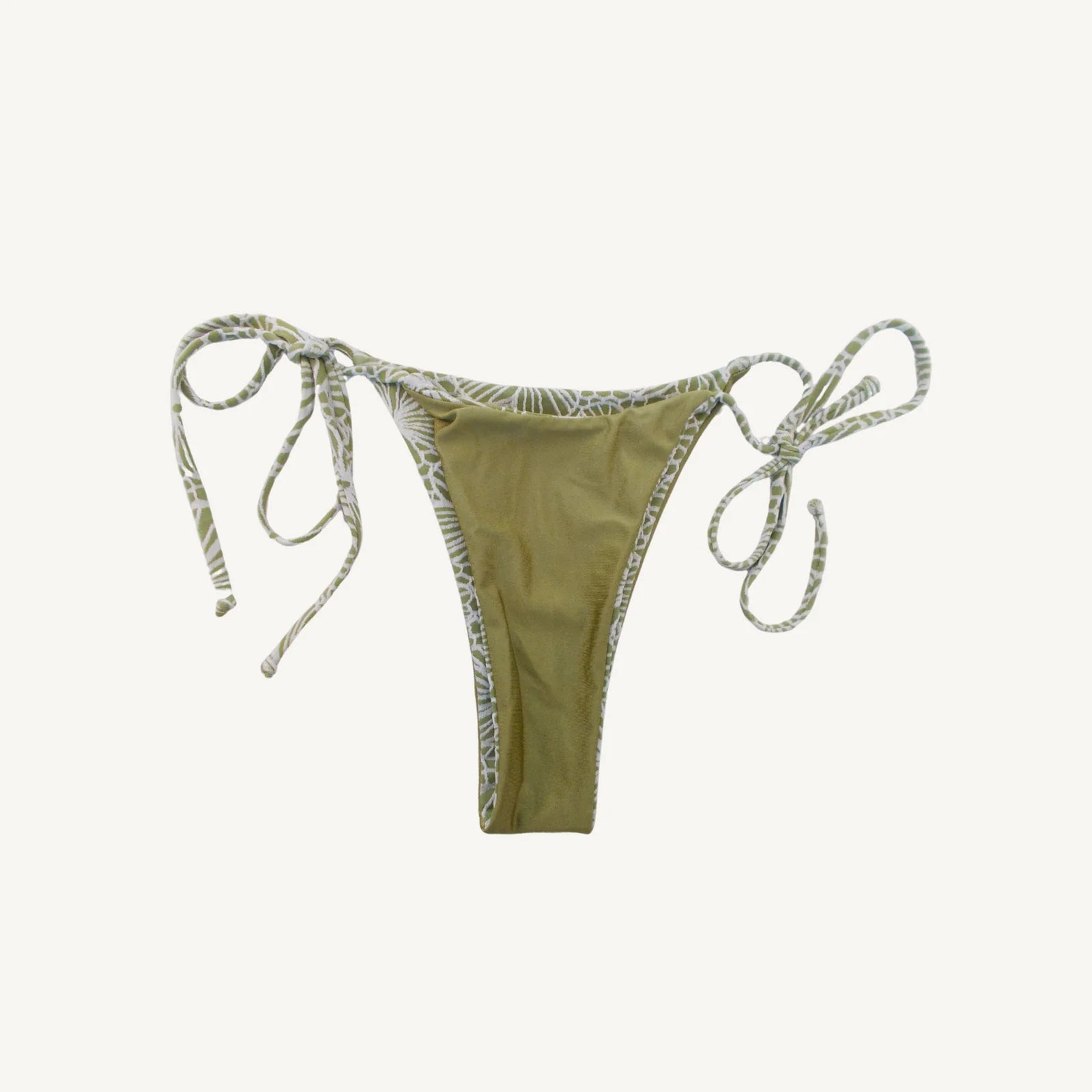 The Marie Bottom is a timeless tie-side bikini made for salt, swim, and sun. Designed in Noosa in a soft olive green with a white shell inspired print. The adjustable sides let you choose your fit and coverage so you can swim, surf, or run along the beach with ease. Fully reversible with a plain olive side for simple days and print for when you want something a little brighter.