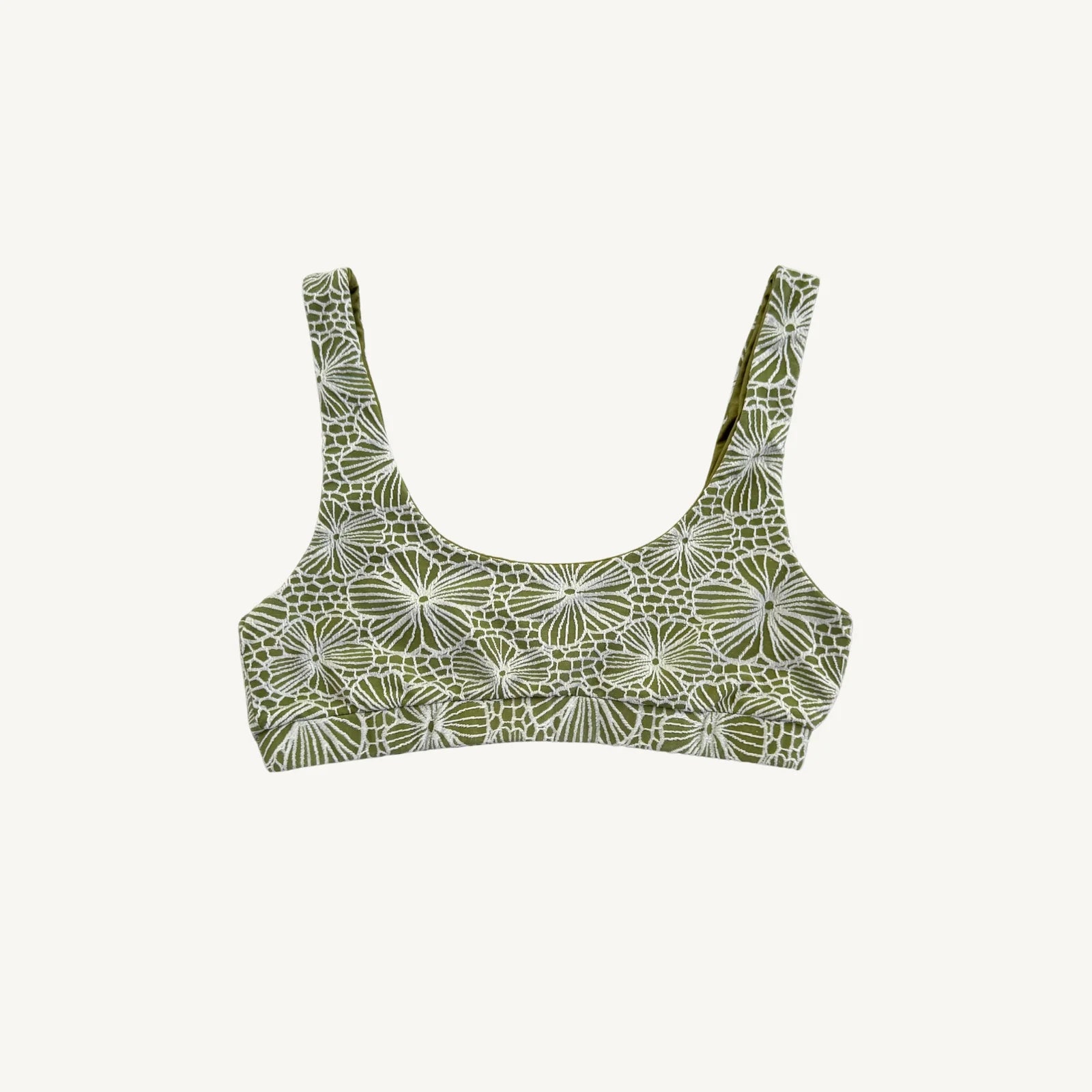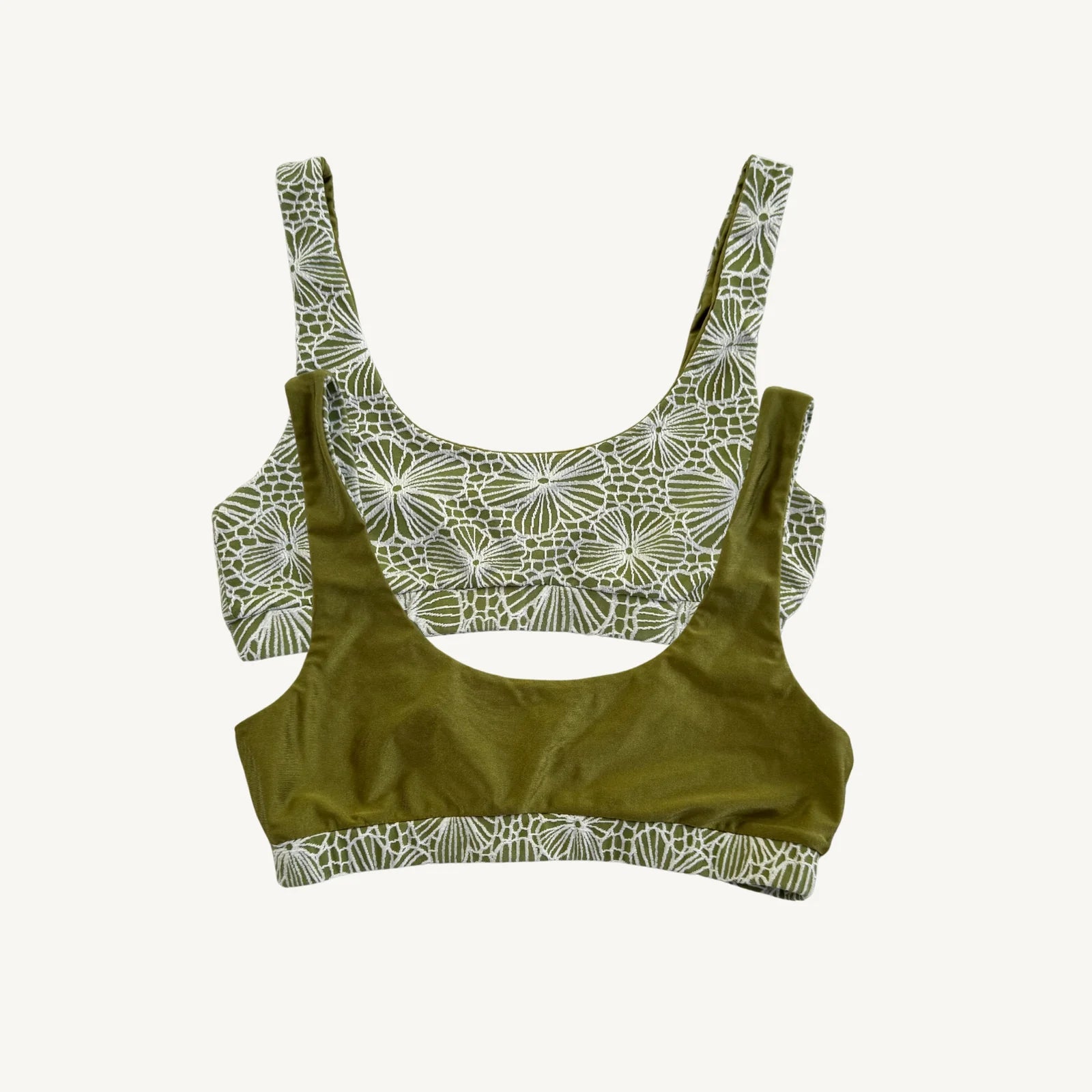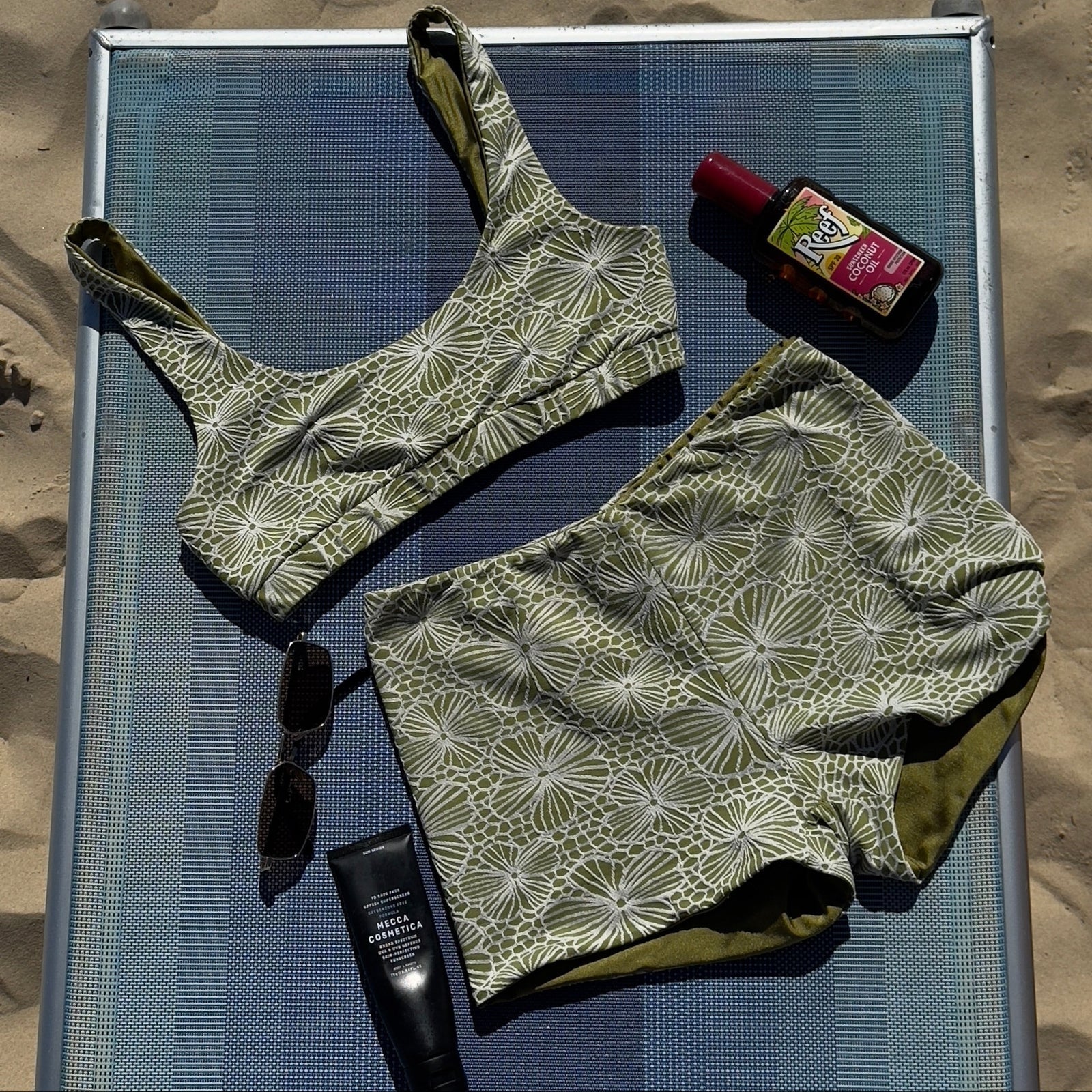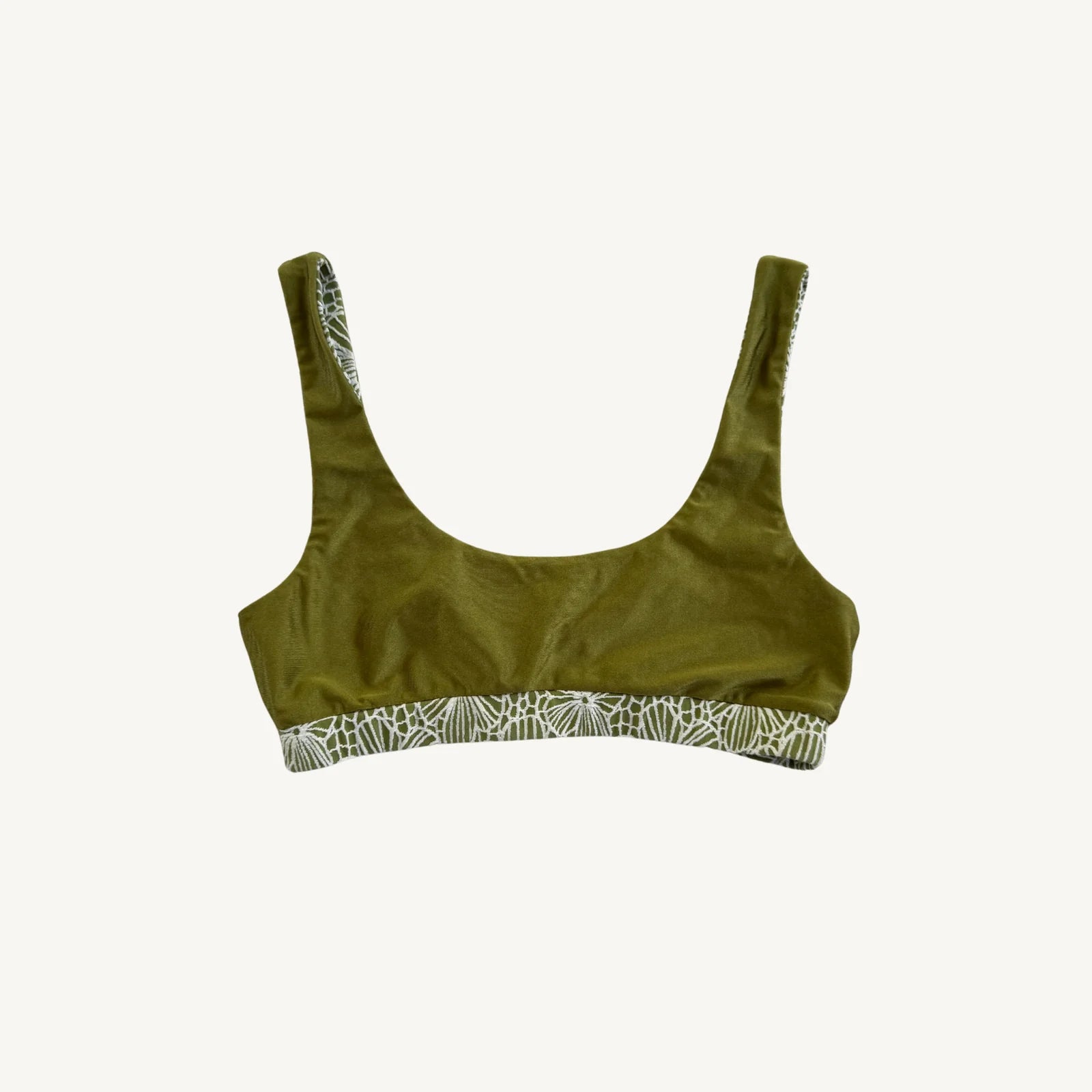 The Ozoux Top is your go-to for slow mornings and days in the sun. Designed in Noosa in a soft olive green with a delicate white shell inspired print. It has a flattering scoop neckline, wide straps and smooth double lining for all-day comfort. Made to move with you from ocean dips to Pilates to coffee after the beach.