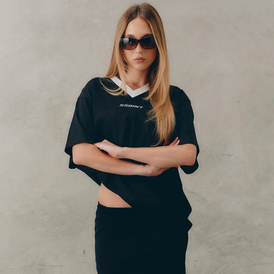 Cut with a clean V-neckline and contrast collar, this long sleeve tee is a nod to classic sportswear with a modern edge. Finished with the SŚAINT silver reflective logo, it’s equal parts statement and staple.