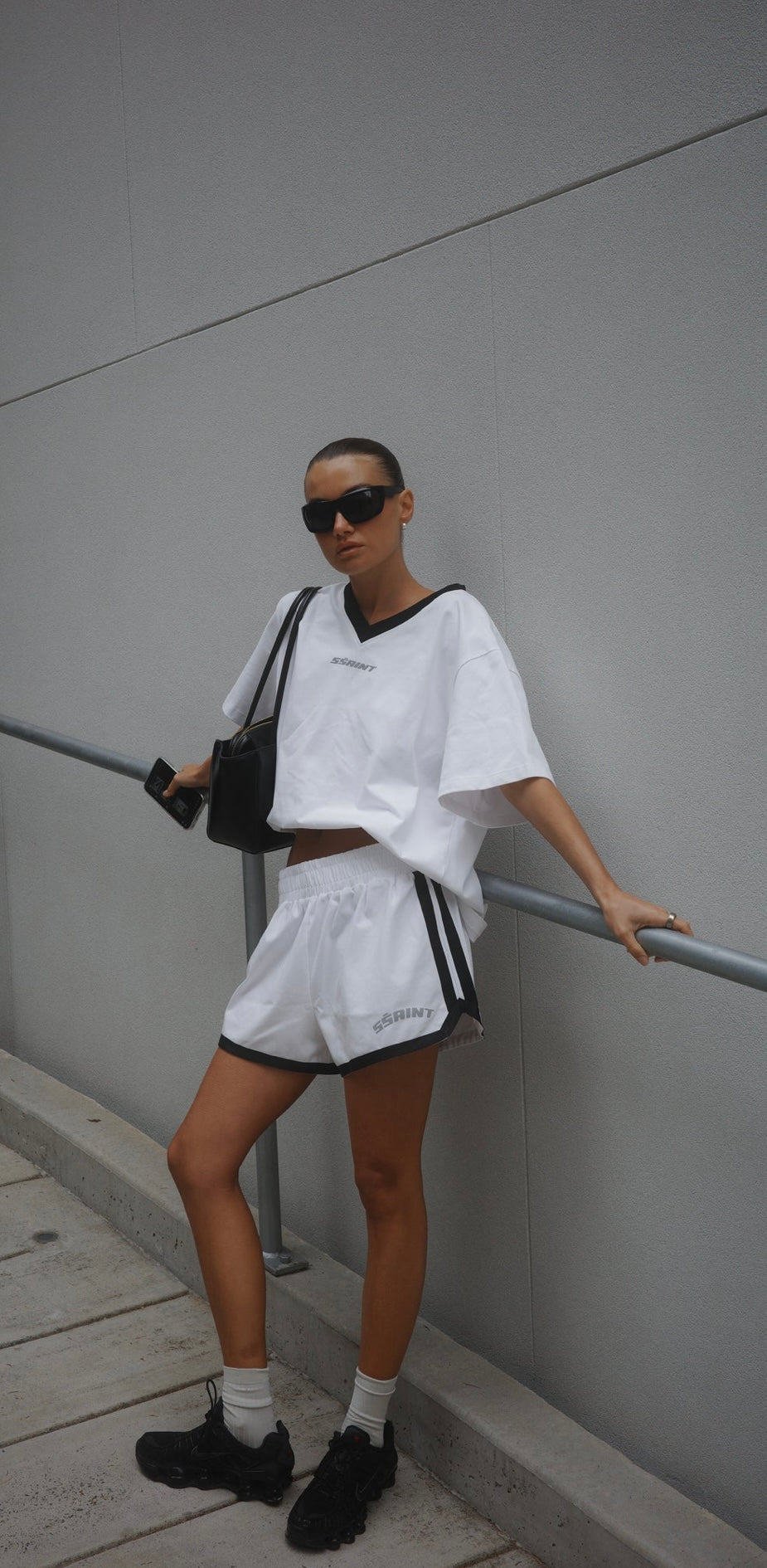 Cut with a clean V-neckline and contrast collar, this long sleeve tee is a nod to classic sportswear with a modern edge. Finished with the SŚAINT silver reflective logo, it’s equal parts statement and staple.