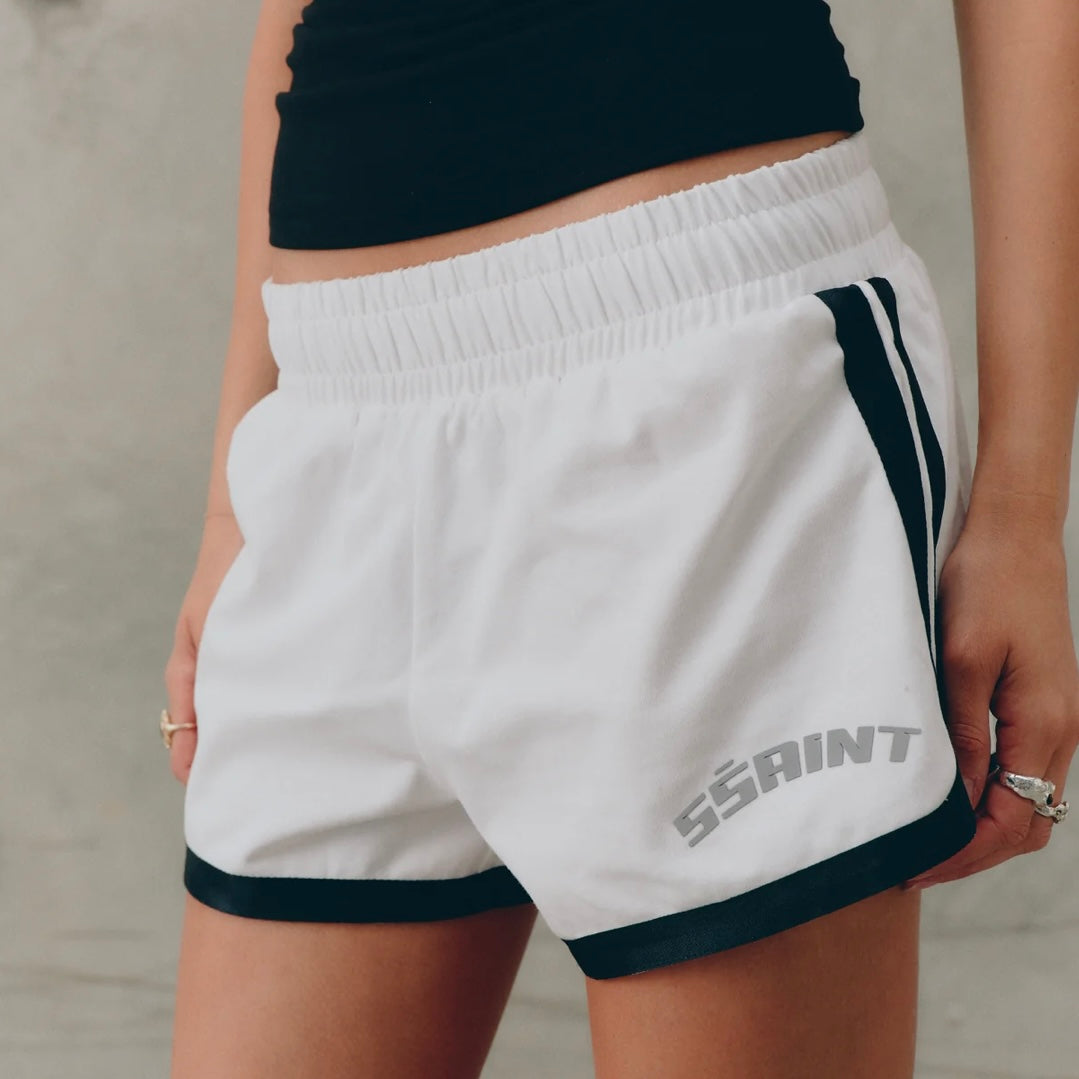 A modern take on the retro sport short. Designed with a relaxed fit, contrast trim, and elastic waistband for everyday comfort. Featuring the signature SŚAINT silver reflective logo, these shorts are versatile enough to wear from lounge to street.